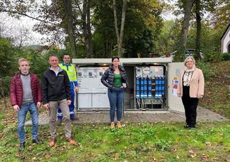 Wie das Stromnetz smarter wird, verdeutlicht der Verteilnetzbetreiber Westnetz durch die Errichtung intelligenter Ortsnetzstationen wir hier in Kasel. Das Foto zeigt (v. l.): Henrik Lewna, Marco Felten, Andreas Rock, Esther Jansen sowie Stephanie Nickels. (Foto: David Kryszons/Westnetz)