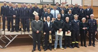 Verleihung bronzenes Ehrenzeichen für 15 Jahre aktiven Dienst: Miriam Brombacher, Holzerath; Eric Jünker, Pluwig-Gusterath; Anne-Catherine Meyer, Waldrach; Lisa Schäfer, Holzerath; Sikorski Jörg, Gutweiler; Lukas Werhan, Waldrach; Julian Bartelmes, Schöndorf; Christoph Becker, Riveris; Christian Becker, Lorscheid; Stefan Hübner, Pluwig-Gusterath; Julius Lauer, Waldrach; Fabian Maier, Lorscheid; Achim Mattes, Thomm; Manuel Nilles, Pluwig-Gusterath; Angela Rock, Thomm