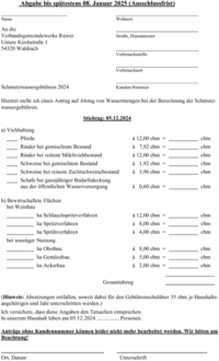 Maßgebend ist das am 05. Dezember 2024 gehaltene Vieh (Stichtag). Das Abwasserwerk Ruwer bittet darum, den umseitig vorbereiteten Antragsvordruck zu verwenden, da die stattfindende, allgemeine Viehzählung für diese Absetzungen nicht voll aussagekräftig ist.