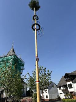 Drei Minuten und 29 Sekunden hat es laut einer aufmerksamen Beobachterin gedauert, bis der wieder herrlich geschmückte Maibaum an der Dohrer Kirche mittels Seilzug von der waagerechten in die endgültige senkrechte Position gebracht war. Aber vorher war viel Vorarbeit erforderlich. Reinhard Lescher hatte den Maibaum im Dohrer Wald gefällt und Lana Göbel, Maximilian Probst und Stefan Schäfer haben den Baum geschält und den Baumschmuck (u.a. zwei mittels Solarversorgung beleuchtete Kränze) in stundenlanger Arbeit gebastelt, welcher weit und breit seinesgleichen sucht. Nachdem Winfried Schäfer, wie in den vergangenen Jahren, den Baum aus dem Wald zur Kirche transportiert hat, haben bei der endgültigen Herrichtung des Maibaums vor Ort und beim Aufstellen weitere Helfer tatkräftig mit angepackt. Als der Baum dann nach der üblichen Anspannung, ob auch alles wie geplant klappt, in seiner vollen Pracht an der Kirche stand, gab es den verdienten Applaus der zahlreich erschienenen Bürgerinnen und Bürger aus Dohr. Der Ortsbürgermeister hatte dann wieder die Ehre, das Wappen der Ortsgemeinde in schwindelerregender Höhe persönlich an den Maibaum schrauben zu dürfen.
