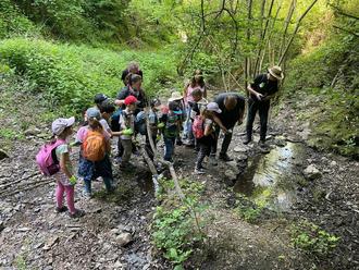 Die Kinder teilten sich zu drei Gruppen mit unterschiedlichen Aufgaben auf, wozu Kinder-Arbeitshandschuhe ausgegeben wurden. Die erste Gruppe besuchte den Feuersalamanderweg und errichteten Totholz- und Lesesteinhaufen. Dabei konnten Sie auch Feuersalamander-Larven in ihren Laichtümpeln beobachten. Die zweite Gruppe trug ebenfalls Totholz, Rebwurzeln und Steine in einem anderen Bachtal zusammen, schichteten das Material auf und schufen somit neue Lebensräume für die Tiere. Gruppe 3 errichtete oberhalb der Wasserentnahmestelle einen sog. Benjes-Zaun mit Ästen und Zweigen, insbesondere aus Korbweiden.