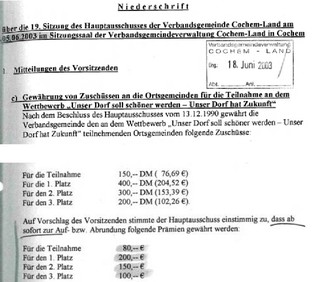 Es wird verwiesen auf den Beschlussauszug von 1990 bzw. 2003 des Hauptausschusses der Verbandsgemeinde Cochem-Land.
