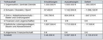 Die Investitionseinzahlungen belaufen sich auf 842.690,03 EUR und die Investitionsauszahlungen auf 2.460.641,39 EUR. Das ergibt im Investitionsbereich einen Fehlbetrag von 1.617.951,36 EUR (Verbesserung gegenüber der Planaufstellung um 1.401.078,64 EUR). Zusammen mit dem Überschuss im ordentlichen Bereich weist die Finanzrechnung einen Finanzmittelfehlbetrag von 224.009,05 EUR aus. Im Vergleich zur Planaufstellung hat sich der Finanzmittelfehlbetrag um 2.231.880,95 EUR reduziert.