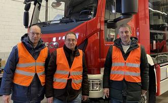 v.l.n.r.: Bernd Löffler, Christof Lieder, Udo Bukschat vor einem baugleichen HLF 20 im Magirus Werk