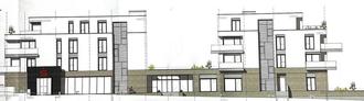 Das Bild zeigt die Front aus Sicht Parkplatz (Südseite) auf die beiden ersten oberen Häuser. Hier werden die Sparkasse und die Praxis ihre Räume haben. Darüber Wohnungen. In gleicher Bauweise - ohne Verbindung zueinander - werden die unteren Gebäude entstehen.