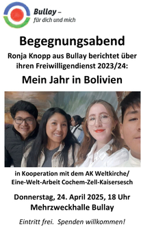 Dabei hält unsere Mitbürgerin Ronja Knopp einen Spannenden Vortrag über die Ableistung ihres Sozialen Jahres in Bolivien. In einer Welt, in der scheinbar nur mehr Geld und Macht eine Rolle spielen, sind Menschen, die sich für Arme und Benachteiligte einsetzen, wichtig und verdienen unsere Anerkennung.