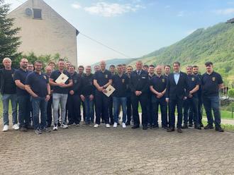 Zudem konnten vor der Wahl mit den Herren Matthias Franze, Jakob Gibbert, Moritz Kroth, Noah Mees, Benedikt Müller, Patrick Schmitz, Jason Sehnem und Simon Stuhler neue Mitglieder durch Bürgermeister Jürgen Hoffmann per Handschlag zum Dienst in der Freiwilligen Feuerwehr Briedel verpflichtet werden. Für 15 Jahre aktive Mitgliedschaft in der Freiwilligen Feuerwehr verlieh der Bürgermeister das Bronzene Feuerwehr-Ehrenzeichen an die Herren Steven Goeres sowie Armin Stuhler. Das Silberne Feuerwehr-Ehrenzeichen für 25jährigen aktiven Dienst konnte Herrn Markus Gippert verliehen werden. Bürgermeister Jürgen Hoffmann gratulierte und bedankte sich für diesen besonderen Dienst für die Allgemeinheit.