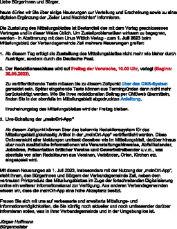 Die Zustellung des Mitteilungsblattes ist Bestandteil des mit dem Verlag geschlossenen Vertrages und in dieser Weise üblich. Um Zustellproblematiken wirksam zu begegnen, werden - in Abstimmung mit dem Linus Wittich Verlag - zum 1. Juli 2023 beim Mitteilungsblatt der Verbandsgemeinde Zell mehrere Neuerungen greifen: