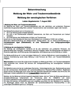 Bitte beachten: Auch wenn Sie aufgrund der Vorgaben zur Meldung der Wein- und Traubenmostbestände nicht verpflichtet sind, können Sie dennoch der Anzeigeverpflichtung der oenologischen Verfahren unterliegen.