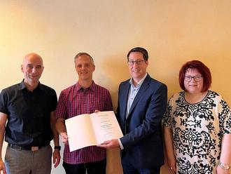 In einer kleinen Feierstunde ließen Stephan Lenartz, Bürgermeister Jürgen Hoffmann, Fachbereichsleiter Markus Grünewald sowie die Personalratsvorsitzende Anke Steffens seinen beruflichen Werdegang Revue passieren.
