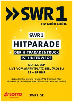 Am Donnerstag, 12.09.2024 macht der „SWR1 Truck“ Station auf dem Marktplatz in Zell. Seid dabei bei der Livesendung von 15 - 19 Uhr und gebt direkt vor Ort Eure Stimme für Eure TOP 1000 der SWR1 Rheinland-Pfalz Hitparade ab.