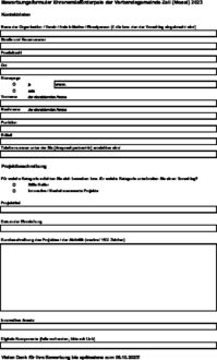 Die Bewerbungsunterlagen/Vorschläge sollten allgemeine Angaben zur ehrenamtlichen Tätigkeit bzw. Organisation sowie detaillierte Angaben zum Projekt beinhalten. Zusätzlich können als Anlagen Presseartikel, Werbematerial oder ein Projektbericht beigefügt werden.