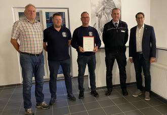 Verbunden mit einer herzlichen Gratulation händigte Bürgermeister Hoffmann die Ernennungsurkunde zum Ehrenamt des Wehrführers für weitere zehn Jahre an Michael Kaufmann aus.