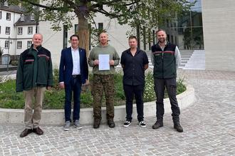 Bürgermeister Jürgen Hoffmann, Forstamtsleiter Jörg Lorscheider, Revierförster Matthias Neuner und Christoff Hammen, stellv. Personalratsvorsitzender, gratulierten Dirk Huthmacher recht herzlich zu seinem 25-jährigen Dienstjubiläum.