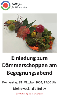 Der nächste Begegnungsabend findet am Donnerstag, 31.10.2024, 18.00 Uhr in der Mehrzweckhalle Bullay statt.