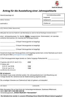Bitte senden Sie uns den ausgefüllten Antrag für einen Parkschein der Einfachheit halber per Mail an parken@zellmosel.de Werden mehrere Parkscheine beantragt, muss jeweils ein separater Antrag gestellt werden.