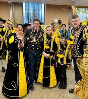Das Zeller Prinzenpaar Prinz Phillip I. und Prinzessin Nicole I. besuchten mit ihrem Gefolge, Musketiere und Soomelissja und dem Kinderprinzenpaar Prinzessin Greta I. und Prinz Justus I. die Verbandsgemeindeverwaltung Zell (Mosel) im festlich geschmückten neuen Rathaus in der Schloßstraße 69.