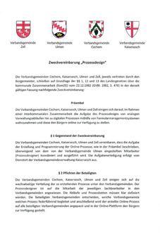 Die Verbandsgemeinden Cochem, Kaisersesch, Ulmen und Zell (Mosel) haben im Rahmen einer interkommunalen Zusammenarbeit eine Zweckvereinbarung zur gemeinsamen Erfüllung aller Aufgaben aus dem Bereich der Erstellung und Programmierung von Online Prozessen geschlossen.