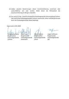 Die Zweckvereinbarung „Prozessdesign“ vom 22.01.2024 wurde von der Kreisverwaltung Cochem-Zell mit Schreiben vom 30.01.2024 gemäß § 12 Abs. 2 des Landesgesetzes über die kommunale Zusammenarbeit (KomZG) genehmigt und wird hiermit öffentlich bekanntgemacht.