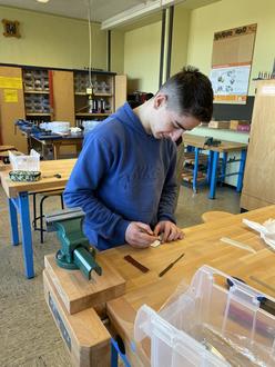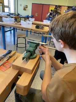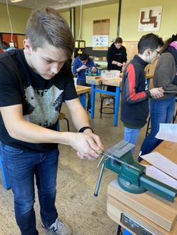 Die Kurse 9 und 10 unter der Leitung von Lehrer Tobias Schumacher und die Kurse 6 bis 8 von Lehrerin Andrea Klein haben die Tische seit einigen Wochen in Gebrauch und melden Positives zurück: Die neuen Werkbänke bieten mehr Platz, sind höhenverstellbar und ermöglichen in Reihe aufgestellt hintereinander zu zweit jeweils den freien Blick nach vorne. Die Schraubstöcke liegen auf einem extra Wagen und nehmen so keinen Platz von der Arbeitsfläche. Auch die „Fußfreiheit“ ist nun gegeben, denn, entgegen den Vorgängermodellen, stören beim Arbeiten die Tischbeine nicht mehr. Dank der größeren Abstände zwischen Tischen und Arbeitsplätzen sind zugleich aktuelle Sicherheitsbedingungen gegeben.