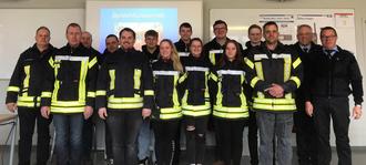 Das Foto zeigt die Lehrgangsteilnehmer mit dem Brand- und Katastrophenschutzinspekteur Harald Schmitz und Kreisausbilder Udo Cornesse.
