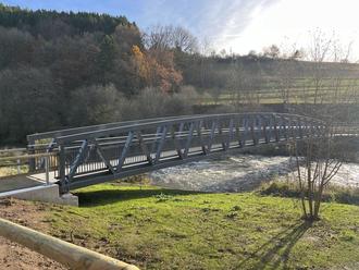 Die Brückenkonstruktion berücksichtigt die Flut-Erfahrungen aus 2021: Sie hat keinen Pfeiler im Flussbett und kann ein Jahrhunderthochwasser wie 2021 ohne Aufstau überstehen. „Es bleibt in diesem Fall noch ein Freibord von ca. 1,25 Meter erhalten“, so Birgit Tegeder vom Landesbetrieb Mobilität. Soll heißen: Auch bei einem 100jährigen Starkregenereignis bliebe über ein Meter Abstand zwischen Wasserspiegel und unterer Bauwerkskante. Die Kosten der Gesamtmaßnahme betrugen rund 792.000 Euro. Baubeginn war im April 2023, die Verkehrsfreigabe des Radweges Mitte November 2023.