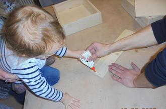 Zusammen mit dem Schreinergesellen Marvin und dem Schreiner-Azubi Paul besuchten die Kinder die Werkstatt der nebenan liegenden Grundschule. Hier sammelten sie erste Erfahrungen im Handwerk: Das Bauen von Holzkisten stand hier im Fokus der Stunde.