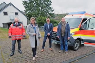 Jan-C. Czichy, Geschäftsführer DRK-Rettungsdienst, Landrätin Julia Gieseking, Bürgermeister Hans Peter Böffgen und Horst Well, Ortsbürgermeister Walsdorf-Zilsdorf im März 2022 zum Start des Probebetriebes des Rettungsstandortes Walsdorf (v.l.)