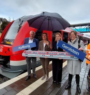 Achim Hallerbach, Verbandsvorsteher Zweckverband SchienenPersonenNahVerkehr Rheinland-Pfalz Nord, Ministerpräsidentin Malu Dreyer, Evelyn Palla, Vorständin Regionalverkehr der Deutschen Bahn und Julia Gieseking, Landrätin Landkreis Vulkaneifel (v.l.) haben die Strecke symbolisch wieder in Betrieb genommen.