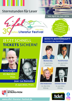 Zum Auftakt des Eifel-Literatur-Festivals liest die Bestsellerautorin Mariana Leky am Freitag, 19. April 2024 in Gerolstein in der Stadthalle Rondell aus ihrem jüngsten Erzählband „Kummr aller Art“. Ihre Figuren schlagen sich darin mit alltäglichen Problemen wie Schlaflosigkeit, Platzangst, Flugangst, Liebeskummer oder allgemeiner Traurigkeit herum. Der Alltag mit seinen Tiefen und tollen Momenten - „ein kleines Buch über Kummer, das erstaunlich gute Laune macht“. Die Veranstaltung ist ausverkauft, aber Wartelisten bieten noch Ticketchancen. Tickets für die Lesungen von Arno Geiger und Jean-Luc Bannalec gibt es über die Festivalhomepage www.eifel-literatur-festival.de, in mehr als 700 Vorverkaufsstellen von Ticket Regional oder telefonisch unter 0651 9790777.