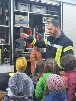 Der Feuerwehrmann zog seine gesamte Ausrüstung an und die Kinder schauten gespannt zu. Alle einzelnen Teile wurden dabei genau erklärt. Jedes Kind hatte auch die Möglichkeit einen Feuerwehrhelm und eine Feuerwehrjacke anzuprobieren. Auf alle Fragen bekamen die Kinder eine ausführliche Antwort. Es wurde auch besprochen, welche Telefonnummer im Notfall angerufen werden muss.