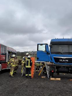Gruppe 2 befasste sich mit der Personenrettung aus einem LKW-Führerhaus. Geübt wurden der effektive Einsatz einer Rettungsbühne, das schnelle Schaffen von Zugängen sowie das taktische Vorgehen unter Berücksichtigung des spezifischen Fahrzeugaufbaus moderner LKW.