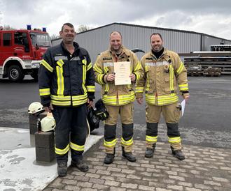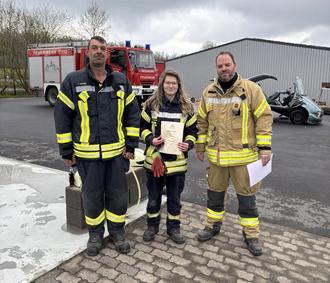 Im Anschluss an die Übung wurden zwei Feuerwehrangehörige für ihre Leistungen und Verdienste ausgezeichnet: Christian Leuschen wurde zum Löschmeister befördert. Sophie Roeser wurde zur Oberfeuerwehrfrau ernannt.