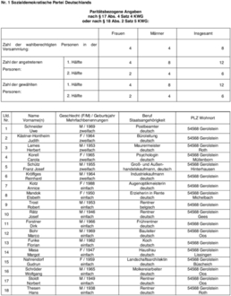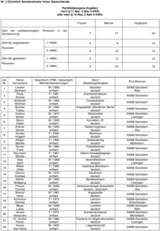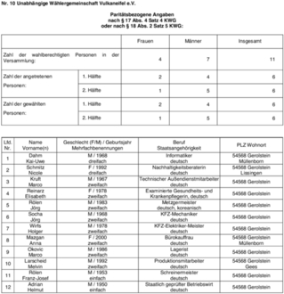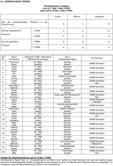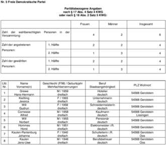 | 3. | Die paritätsbezogenen Angaben nach § 17 Abs. 4 Satz 4 bzw. § 18 Abs. 2 Satz 5 KWG sind nachstehend für jeden Wahlvorschlag getrennt aufgeführt. |