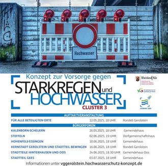 Der Flyer wird zudem bei den Starkregen- und Hochwasservorsorge-Veranstaltungen der Verbandsgemeinde Gerolstein ausgelegt. Ab 26. Mai starten die Bürgerforen der Gemeinden im Cluster 3 in Kalenborn-Scheuern, Steffeln, Hohenfels-Essingen, der Stadt Gerolstein sowie der Stadtteile Bewingen, Hinterhausen, Oos und Gees.