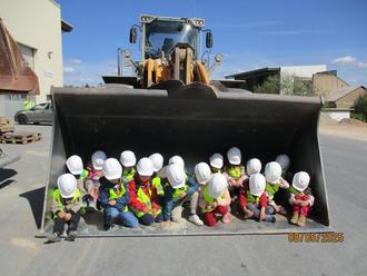 Danach ging es dann voll ausgestattet mit Warnweste, Schutzhelm und Schutzbrille auf einen Rundgang durch den Betrieb. Die Kinder erfuhren einiges über den Hochofen, das Beladen der LKWs mit verschiedenen Körnungen und wie die LKW-Waage funktioniert. Jedes Kind konnte Beton zusammenmischen und damit dann verschiedene Formen ausgießen, die sie demnächst mit nach Hause nehmen. Natürlich waren auch die riesigen Fahrzeuge sehr beeindruckend. So hatten z.B. 17 Kinder genügend Platz in der großen Schaufel eines Radladers.