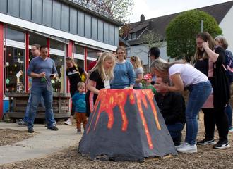 Die Erzieher:innen der Kita boten den Kindern anschließend acht tolle Stationen zum Thema „Vulkanismus“. An diesen konnten die Kinder sich durch Experimentieren, Ausprobieren, Malen, Basteln und Bewegen mit einer Stempelkarte einen Orden für diesen Tag verdienen.