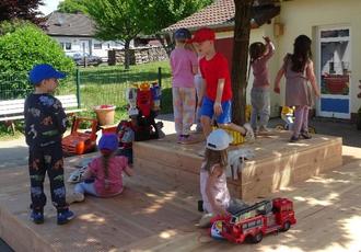 In den vergangenen Jahren wurde der Innenhof des Kindergartens immer wieder durch neue Spielgeräte und Spielstationen umgestaltet. In diesem Jahr stand der Bau eines Spielpodestes auf dem Plan. Nachdem ein individueller Entwurf erstellt war, machte sich unser Kindergarten-Vater Herr Tobias Weis in seiner Werkstatt an die Arbeit. Er schnitt das Holz auf Maß zu und traf alle weiteren Vorbereitungen. So konnte er an einem Nachmittag, dank der Unterstützung von zwei weiteren Vätern und einem Opa, das Spielpodest in unserem Innenhof aufbauen.