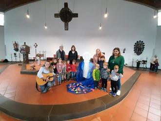 Frau Weber leitete die Andacht und betonte in ihrer Ansprache die Bedeutung von Maria als Beschützerin und Mutter aller Menschen. Die Erzieher der Kita St. Nikolaus und der Kita im Goldecken beteiligten sich mit Fürbitten am Gottesdienst.