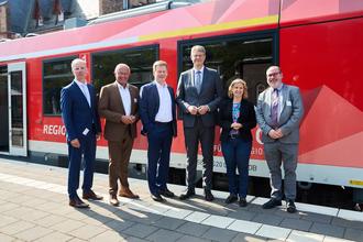 Dr. Norbert Reinkober, Geschäftsführer go.Rheinland; Achim Hallerbach, Verbandsvorsteher SPNV-Rheinland-Pfalz Nord; Dr. Richard Lutz, DB-Vorstandsvorsitzender; Patrick Schnieder, Bundesverkehrsminister; Katrin Eder, Ministerin für Klimaschutz, Umwelt, Energie und Mobilität des Landes Rheinland-Pfalz; Jean-Paul Lickes, Direktor für Mobilität, Verkehr und Transportinfrastruktur und Erster Regierungsberater Großherzogtum Luxemburg (v.l.)