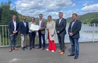 Zur offiziellen Übergabe des Förderbescheides trafen sich die vier Mitglieder des Zweckverbandes aus NRW und Rheinland-Pfalz mit Ministerin Ina Scharrenbach und weiteren Vertretern an der Staumauer des Kronenburger Sees. Das Land Rheinland-Pfalz übernimmt in einer internen Abwicklung zwischen den beiden Bundesländern rund 1/3 der Kosten und wurde durch den Präsidenten der Struktur- und Genehmigungsdirektion (SGD) Nord, Wolfgang Treis vertreten.