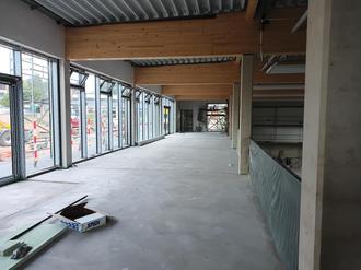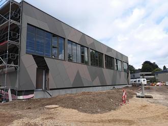 An der Sporthalle Hillesheim wird die Fassade angebracht und der Innenausbau geht voran.