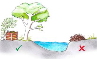 Komposthaufen, Holzlager und Strohballen gehören nicht ans Gewässer. Ablagerungen zu nah am Gewässer können bei Hochwasser abgeschwemmt werden und sich flussabwärts an Engstellen (z.B. Rohrdurchlässe, Einläufe, Brücken) verkeilen.