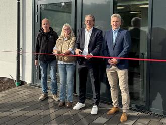Banddurchschnitt am Katimex-Neubau mit Architekt Matthias Dimmer, den Geschäftsführern Anke Stähr und Christian Stähr und Bürgermeister Hans Peter Böffgen (v.l.).