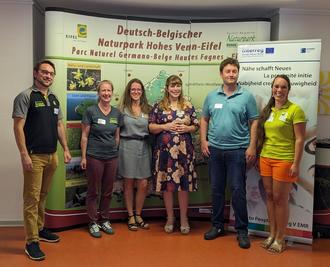Dominik Hosters (Geschäftsführer NRW, Naturpark Nordeifel e.V.), Anne Derks (Geschäftsführerin RLP, Naturpark Nordeifel e.V.), Sonja Fickers (Projektleiterin People to People der Interreg-Region Euregio Maas-Rhein) sowie die Projektmitarbeiter Susanne Graul, Markus Melder und Florine Crutzen (v.l.)