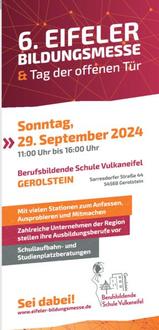 Am Sonntag, 29. September von 11 bis 18 Uhr erhalten alle Interessierten aus erster Hand Informationen über Ausbildungsberufe, Studiengänge und Weiterbildung in der Sporthalle, auf dem Schulhof und in zahlreichen Klassenräumen der BBS Vulkaneifel in Gerolstein. Mit dabei ist auch die Verbandsgemeindeverwaltung. Wir präsentieren unsere Ausbildungsberufe und Karrieremöglichkeiten an einem Stand in der Sporthalle und freuen uns über Ihren Besuch.