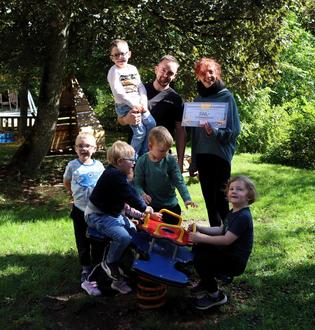 Die Kinder der Kita mit Leiterin Sina Domenghino freuen sich über die Spendenübergabe durch Robert Ensch.