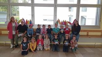Franziska Lehmann (Klassenlehrerin), Peter Ludwig (AWO), die Erstklässler, Margret van Nerven (AWO) (v. l.)