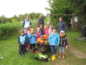 Am 19. September besuchten wir auch in diesem Jahr wieder den Öko- Nutzgarten in Dohm Lammersdorf. Herr Kesten hat uns sehr freundlich in seinem Garten empfangen. Wir durften mit ihm Kartoffeln und Gemüse ernten. Herr Kesten hat sie ausgegraben und wir haben sie eingesammelt. Es gibt sogar rote Kartoffeln. Sie heißen Laura. Auch Kürbisse, Möhren, Tomaten, Wirsing, Zwiebeln und Kohl durften wir miternten und mit in den Kindergarten nehmen.