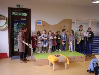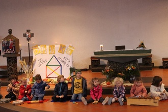 Am 25. September 2022 feierten wir gemeinsam mit unseren Kindern, Familien und vielen Gästen das 50-jährige Jubiläum unserer Kindertagesstätte. Zum Auftakt unseres Festes zeigten uns die Kinder in einem Erntedankgottesdienst all das, was sie im Laufe des Jahres in unseren Beeten, die wir als „Kita isst besser“ - Kita deutlich erweitert haben, angepflanzt haben. Sie brachten die Früchte ihrer Ernte zum Altar und bedanken sich dafür.